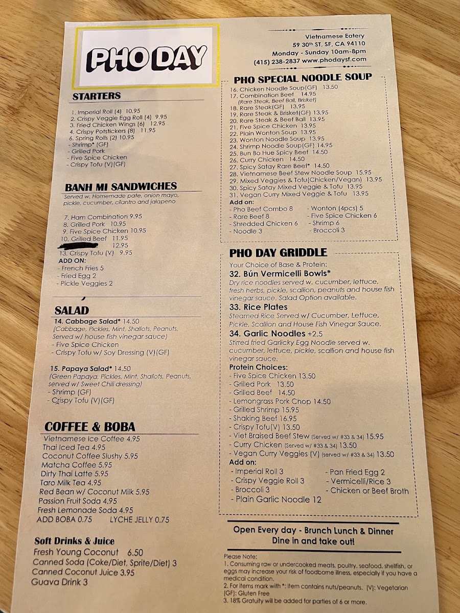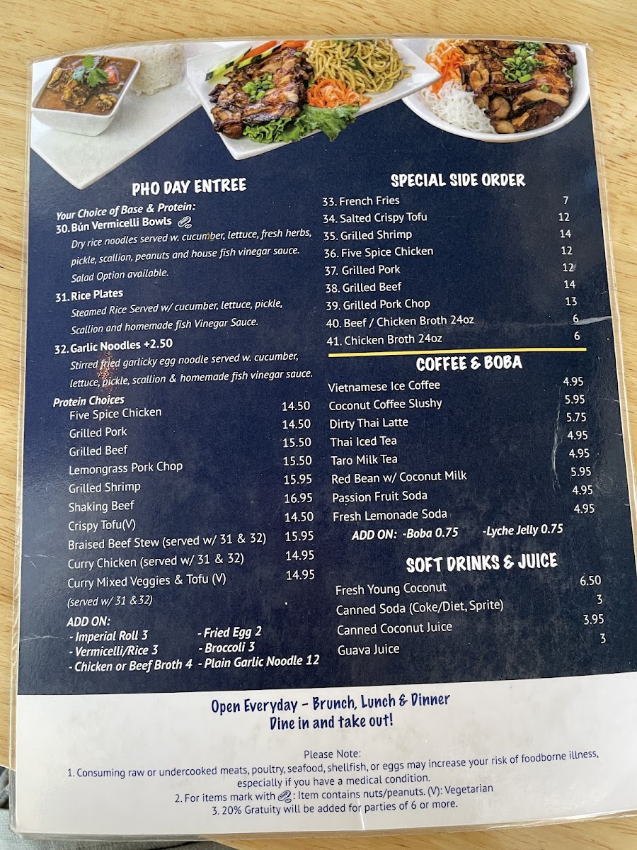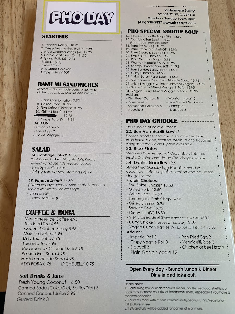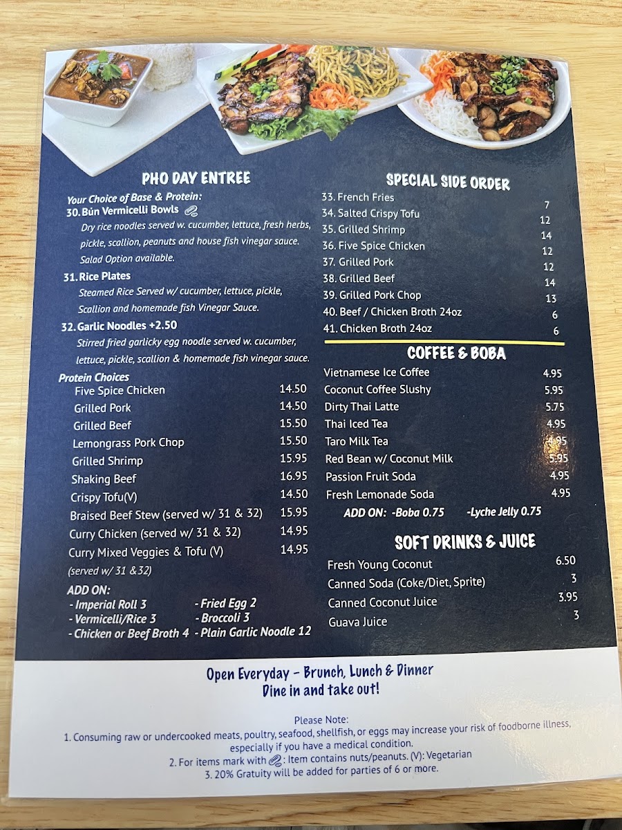 Pho Day offers a delightful and diverse menu with a wide range of delicious dishes, perfect for any taste. For side orders, you can try the Five Spice Chicken or the Grilled Pork for a flavorful start. The appetizers include fan favorites such as Shrimp Spring Rolls and Salted Crispy Tofu, while the Five Spice Chicken Spring Roll and Imperial Rolls provide unique twists. For a refreshing drink, the NEW Matcha Strawberry* and NEW Oat Matcha Latte* stand out, along with the Thai classics like Thai Iced Tea and NEW*Thai Tea Einspanner. The garlic noodle section offers a variety of mouth-watering options like Curry Veggie Garlic Noodle and Grilled Beef Garlic Noodle, while the rice plates feature comforting choices such as Crispy Tofu W/Rice and Bo Kho Beef Stew W/Rice. The Pho Noodle Soup menu is extensive, including the comforting Five Spice Chicken Noodle Soup and Mixed Veggies & Tofu Pho, with special pho options like Bun Bo Hue Spicy Beef Noodle Soup and Spicy Satay W/ Rare Beef Noodle Soup. There’s also a range of refreshing non-caffeinated drinks like Passion Fruit Soda and Taro Milk, along with signature coffees including the NEW*Toffee Phin and Vietnamese Iced Coffee. For a satisfying sandwich, the NEW Roasted Eggplant Banh Mi* and Grilled Pork Banh Mi are delicious picks. Lastly, the Bun Vermicelli options like Grilled Pork & Roll Vermicelli and the fresh salads such as Papaya Salad W/Shrimp and Cabbage Salad W/Five Spice Chicken are excellent light options. With so many tempting dishes, Pho Day delivers a satisfying and flavorful dining experience.