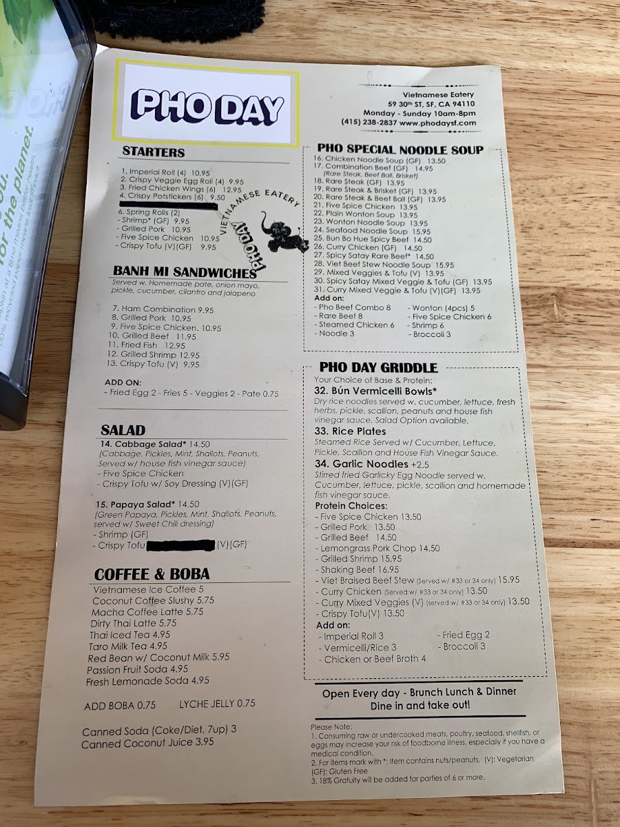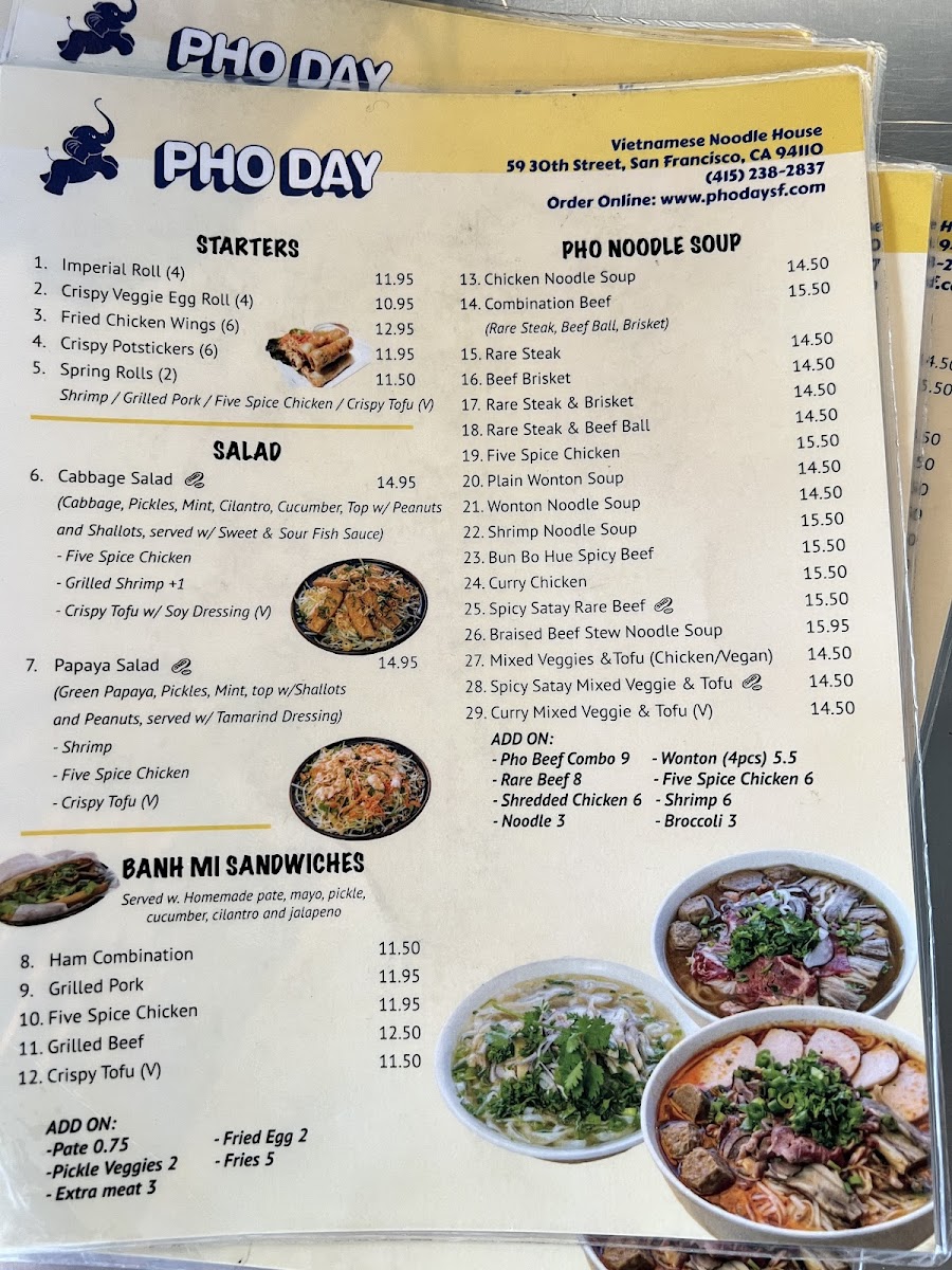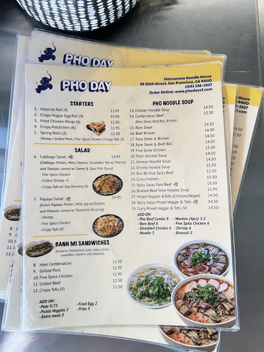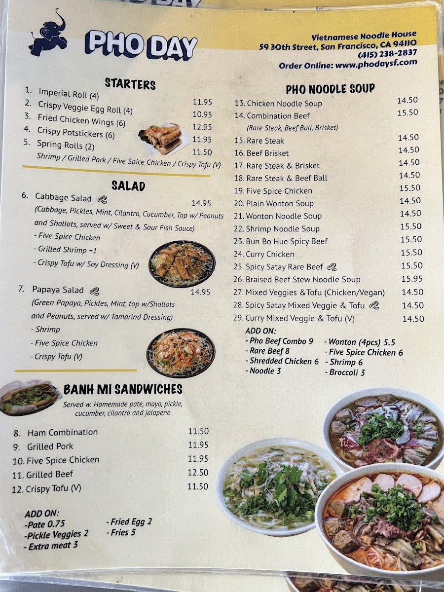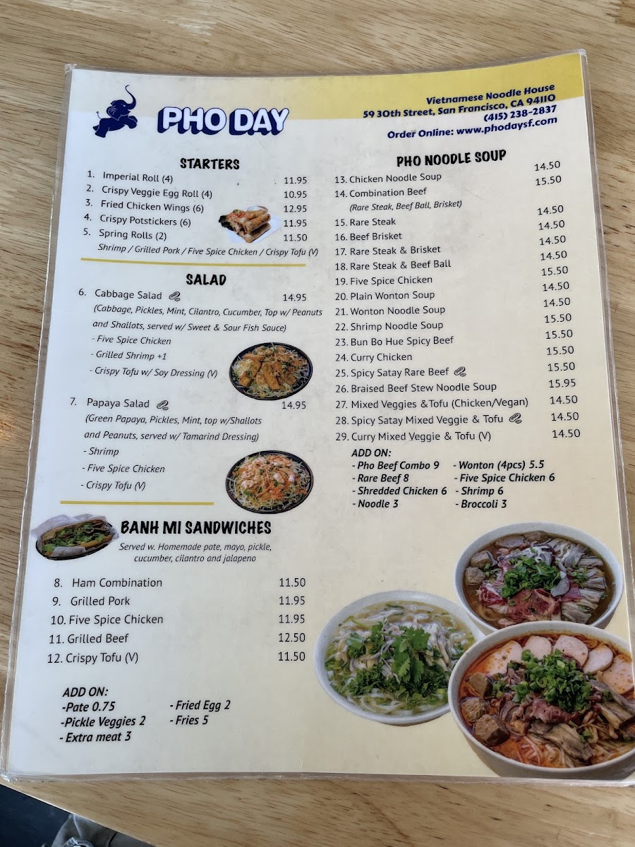Pho Day offers a delightful and diverse menu with a wide range of delicious dishes, perfect for any taste. For side orders, you can try the Five Spice Chicken or the Grilled Pork for a flavorful start. The appetizers include fan favorites such as Shrimp Spring Rolls and Salted Crispy Tofu, while the Five Spice Chicken Spring Roll and Imperial Rolls provide unique twists. For a refreshing drink, the NEW Matcha Strawberry* and NEW Oat Matcha Latte* stand out, along with the Thai classics like Thai Iced Tea and NEW*Thai Tea Einspanner. The garlic noodle section offers a variety of mouth-watering options like Curry Veggie Garlic Noodle and Grilled Beef Garlic Noodle, while the rice plates feature comforting choices such as Crispy Tofu W/Rice and Bo Kho Beef Stew W/Rice. The Pho Noodle Soup menu is extensive, including the comforting Five Spice Chicken Noodle Soup and Mixed Veggies & Tofu Pho, with special pho options like Bun Bo Hue Spicy Beef Noodle Soup and Spicy Satay W/ Rare Beef Noodle Soup. There’s also a range of refreshing non-caffeinated drinks like Passion Fruit Soda and Taro Milk, along with signature coffees including the NEW*Toffee Phin and Vietnamese Iced Coffee. For a satisfying sandwich, the NEW Roasted Eggplant Banh Mi* and Grilled Pork Banh Mi are delicious picks. Lastly, the Bun Vermicelli options like Grilled Pork & Roll Vermicelli and the fresh salads such as Papaya Salad W/Shrimp and Cabbage Salad W/Five Spice Chicken are excellent light options. With so many tempting dishes, Pho Day delivers a satisfying and flavorful dining experience.
